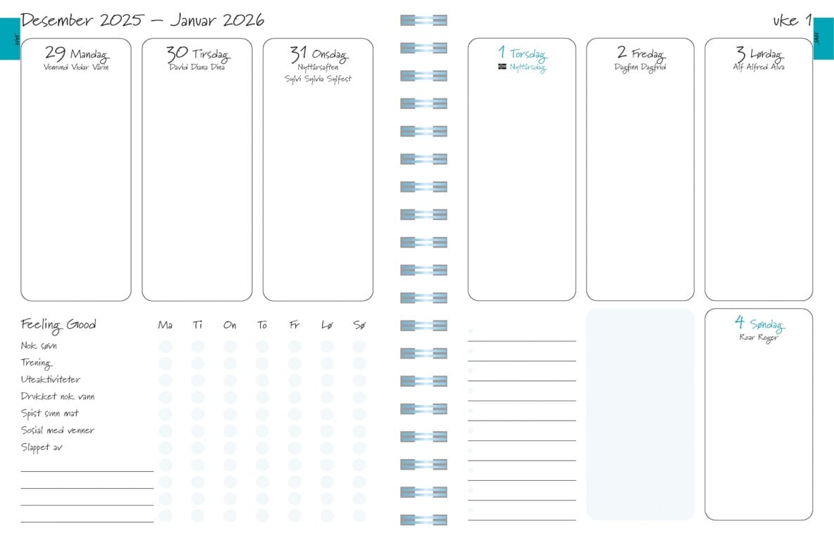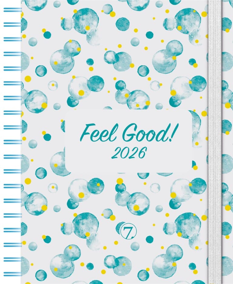 7.sans Feel Good i A5 format er en flott spiralsert kalender m,ed en uke på to sider. Oppsummering og planer for hver måned, budsjettskjema. Omslagstrikk sørger for å holde løsepapirer på plass. Måneds og årsoversikter. Eget ark med stickers. Alle 7.sans produkter er miljøsertifisert etter anerkjente internasjonale standarder slik at de minst mulig påvirker vårt felles ytre miljø. Sidestørrelse: 14,8 x 21 cm En uke på to sider med god notatplass Norsk Budsjettoversikt for hver måned Blå søndager og helligdager 100 gr papir Spiralisert Eget ark med stickers Plastlomme Årsoversikt innværende og neste år Månedsplaner inneværende og neste år Månedsoversikt foran hver måned Notatsider Norske navnedager © Norske helligdager