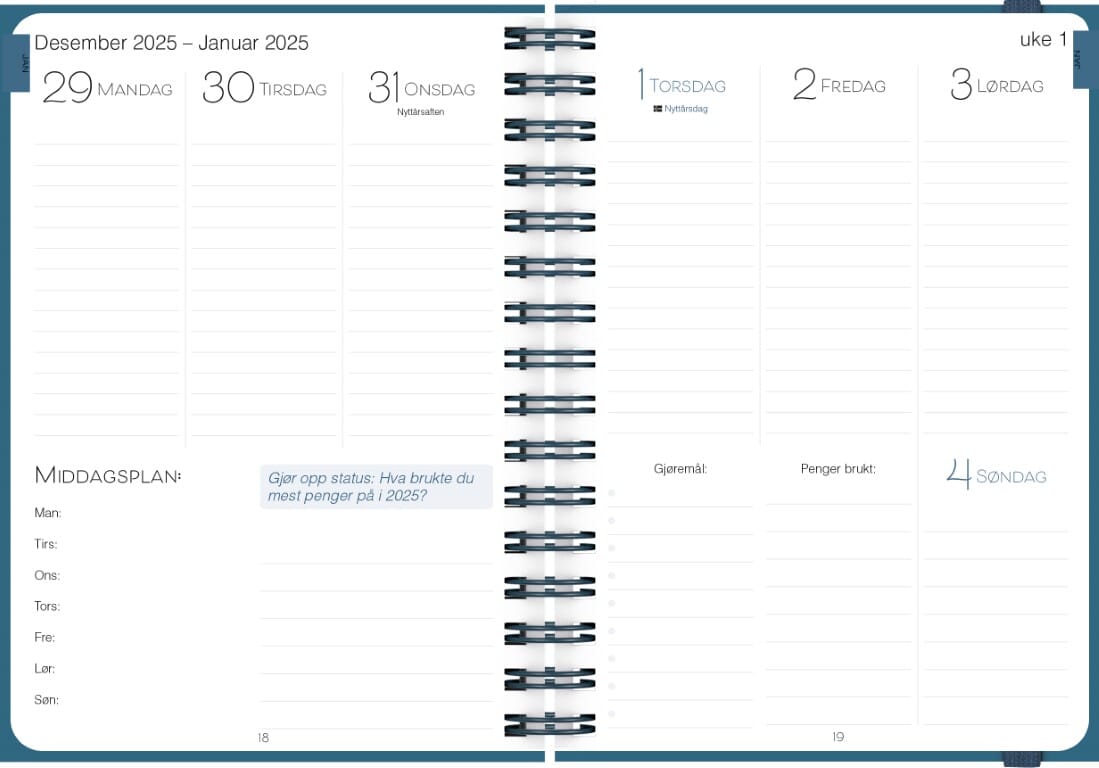 7.sans Pengesnakk året rundt er utviklet i samarbeid med Lise Vermelid Kristoffersen. Hun står bak suksessboken Pengesnakk, blogg og podcast med samme navn. Med Pengesnakk året rundt får du muligheten til å organisere dagene dine og få full kontroll over hverdagen, samtidig som du får tips og ideer til en bedre økonomi. Dette får du: Pengetips hver eneste uke Budsjettsider Plass til ukemenyer Evaluering og mål for hver måned Spareplaner Notatsider og mye mer. Alle 7.sans produkter er miljøsertifisert etter anerkjente internasjonale standarder slik at de minst mulig påvirker vårt felles ytre miljø. Sidestørrelse: 14,8 x 21 cm En uke på to sider med god notat-plass Lises egne sider med skjemaer og spareplaner Norsk språk Grønne søndager og helligdager 100 gr papir Spiralisert Årsoversikt innværende og neste år Månedsplaner inneværende og neste år Månedsoversikt foran hver måned Notatsider Norske navnedager © Norske helligdager