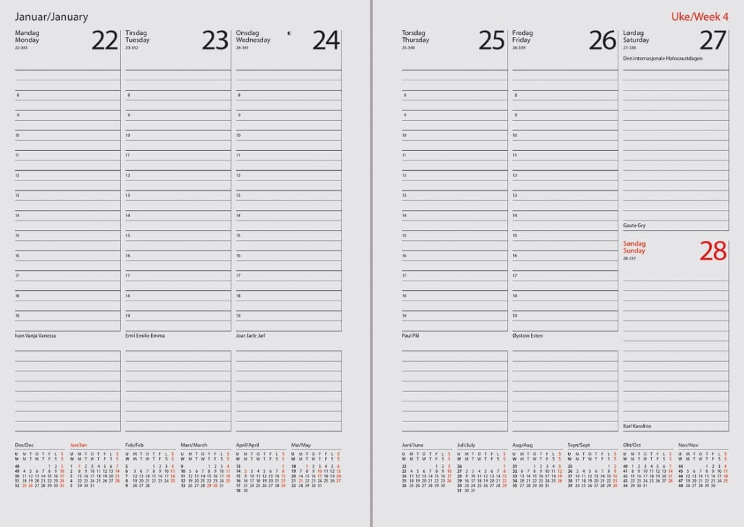 "7.sans Termin er en av vår bestselgere hva gjelder avtalebøker i A5 format. Av mange og kalt sjefskalender Samme utforming som den noe større Novum. Stående kolonner ser ut til å være en favoritt. Slank utførelse gjør den enkel å ha med. Finnes i mange varianter hva gjelder innbinding og design som gjør at de flest finner sin favoritt. Disse produktene er ypperlig for profilering av din egen virksomhet. Enkle trykkemetoder gjør at du enkelt kan lage den veldig personlig. Alle 7.sans produkter er miljøsertifisert etter anerkjente internasjonale standarder slik at de minst mulig påvirker vårt felles ytre miljø. Sidestørrelse: 14,8 x 21 cm Hjørneperforering 70 gr papir En uke på to sider Norsk Klokkeslett fra-til: 08:00-19:00 Røde søndager og helligdager Årsoversikt innværende og neste år Månedoversikt inneværende og neste år Notatsider 16 sider atlas Norske navnedager © Norske helligdager"