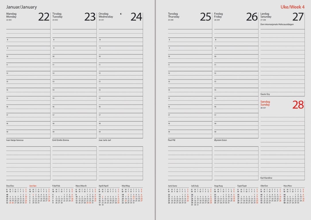 "7.sans Termin er en av vår bestselgere hva gjelder avtalebøker i A5 format. Av mange og kalt sjefskalender Samme utforming som den noe større Novum. Stående kolonner ser ut til å være en favoritt. Slank utførelse gjør den enkel å ha med. Finnes i mange varianter hva gjelder innbinding og design som gjør at de flest finner sin favoritt. Disse produktene er ypperlig for profilering av din egen virksomhet. Enkle trykkemetoder gjør at du enkelt kan lage den veldig personlig. Alle 7.sans produkter er miljøsertifisert etter anerkjente internasjonale standarder slik at de minst mulig påvirker vårt felles ytre miljø. Sidestørrelse: 14,8 x 21 cm Hjørneperforering 70 gr papir En uke på to sider Norsk Klokkeslett fra-til: 08:00-19:00 Røde søndager og helligdager Årsoversikt innværende og neste år Månedoversikt inneværende og neste år Notatsider 16 sider atlas Norske navnedager © Norske helligdager"