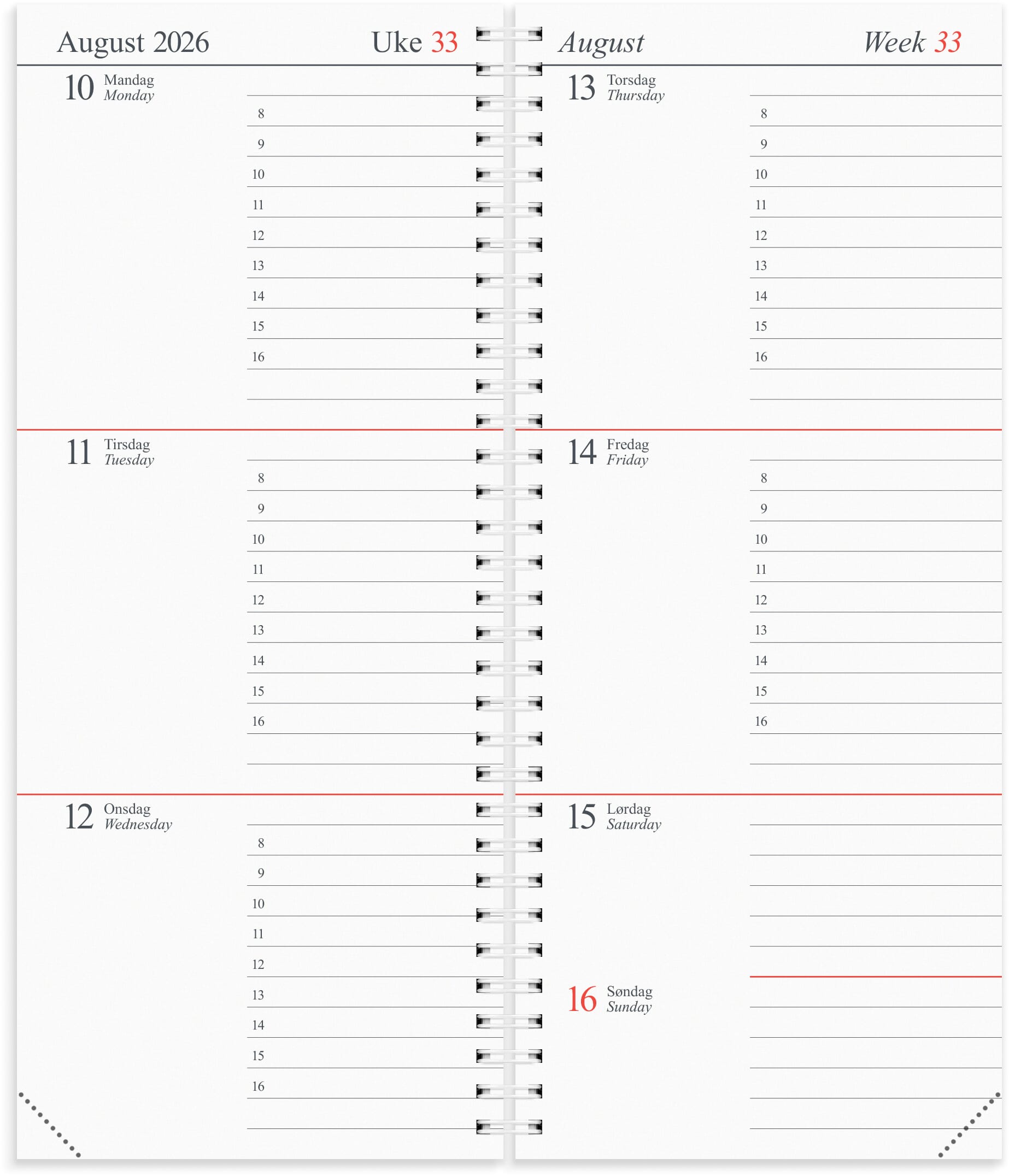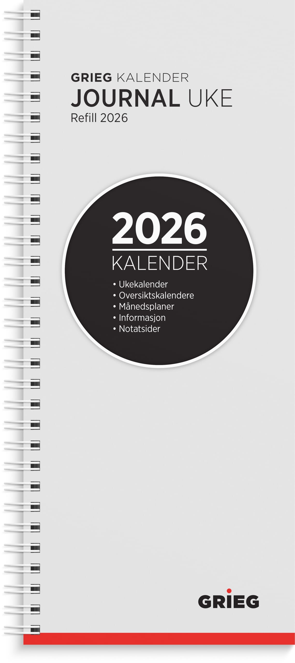 Spiralisert ukekalender refill som følger året. Journalkalenderen har norsk og engelsk kalendarium. I denne kalenderen går hele uken over to sider, og det gode formatet gir deg god plass til dine notater. Den inneholder kalendariske opplysninger, Telefonguide, Månedsoversikt, Årsoversikt, månefaser, helligdager og kongelige fødselsdager. Kalenderen er miljømerket FSC®, som betyr at den er produsert med papir og annet trevirke fra et ansvarlig og bærekraftig skogsbruk. - Følger kalenderåret - Omslag i kartong - Spiralisert - Liggende uke/oppslag. Timeinndeling 8-16 - Månedsplaner og årsoversikt for inneværende og kommende år - Månefaser, helligdager og kongelige fødselsdager - Hjørneperforering - Linjerte notatsider - Antall sider: 128 sider - Papirvekt: 100g - Format: 112x266mm