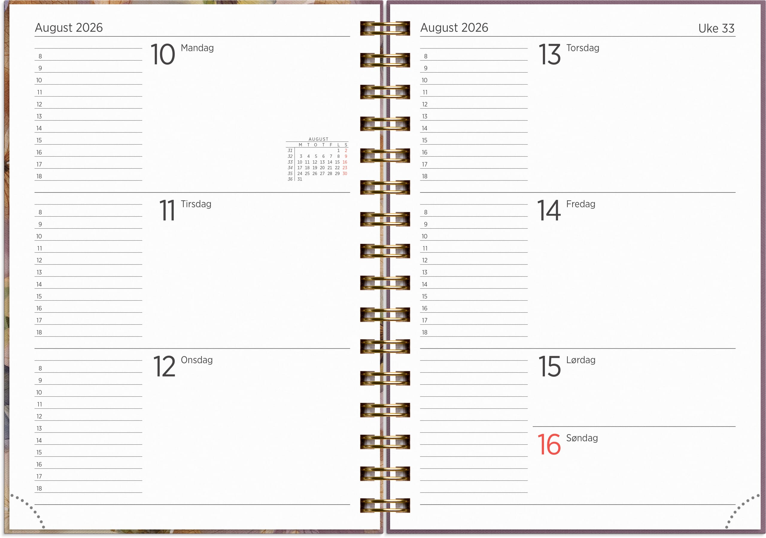 Leo Fiol er en spiralisert ukekalender i trykket kartongomslag med flott design. Kalenderen har hele uken over to sider og det gjør det oversiktlig å holde kontroll på ukens avtaler. Den har gullfarget spiral og gullfarget preget årstall. Den inneholder kalendariske opplysninger, telefonguide, månedsoversikt, årsoversikt, månefaser, helligdager og kongelige fødselsdager. - Spiralisert ukekalender for året 2026 - Følger kalenderåret - Omslag i mykt kartong - Liggende uke/oppslag - Timeinndeling 8-18 mandag til fredag - Månedsplaner og årsoversikt for inneværende og kommende år - Månefaser, helligdager og kongelige fødselsdager - Hjørneperforering - Antall sider: 136 - Papirvekt: 100g - Format: 148x210 mm - Farge: Fiol