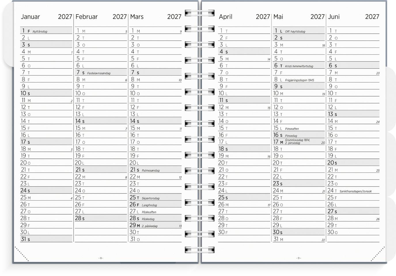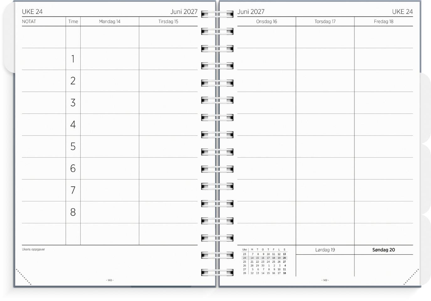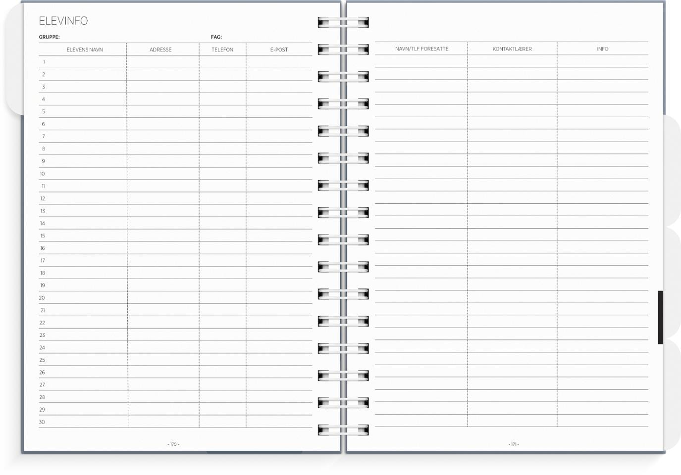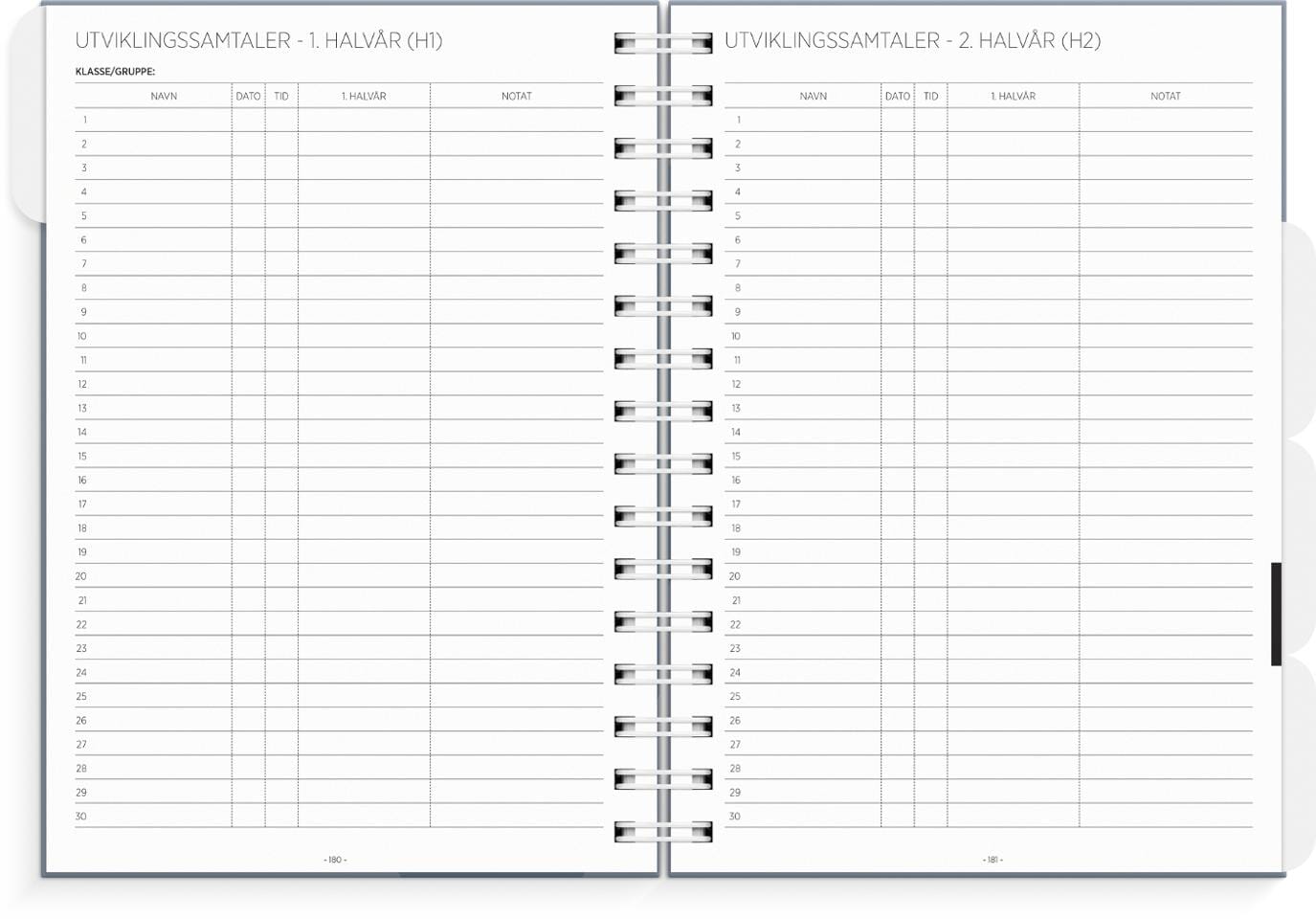Spiralisert ukekalender for lærere i den videregående skolen Timeplan, månedsplan, halvårsplaner og oversiktskalendere Notatsider pr. uke Dot Notes sider Kopieringsmal for utviklingssamtaler Klassekart, elevinfo og læreroversikt pr. klasse/gruppe Underveisvurdering, fravær, orden og oppførsel 4 flyttbare skillekort i plast - det ene med linjal 2 papirlommer bak 100 g. papir FSC® Format: 148 x 210 mm