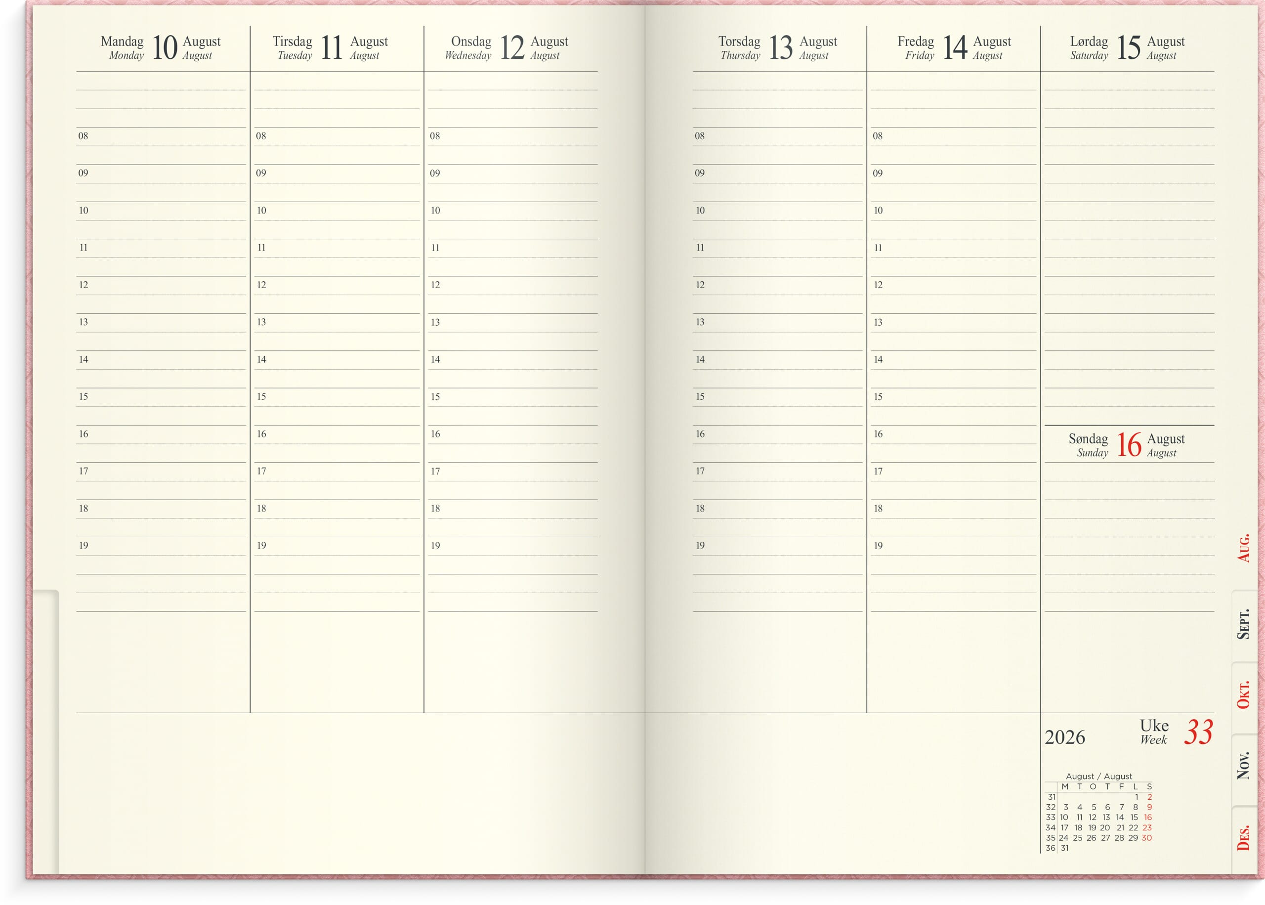 Planlegg med presisjon og eleganse med GRIEG Sjefskalender A5. Kalenderen kombinerer funksjon og finesse med eksklusivt kremfarget papir, utstanset månedsregister og omslag i imitert skinn. Den praktiske A5-størrelsen gir deg oversikt uten å ta for mye plass, perfekt både på kontorpulten og i vesken. Med både norsk og engelsk kalendarium og lesebånd er dette et gjennomført valg for profesjonelle. Inneholder også kalendariske opplysninger, telefonguide, månedsoversikt, årsoversikt, månefaser, helligdager og kongelige fødselsdager. - Funksjonell innbundet sjefskalender for året 2026 - Følger kalenderåret - Omslag i imitert skinn - Lesebånd og kremfarget papir - Stående uke/oppslag. Timeinndeling 8-19 mandag til fredag - Månedsplaner og årsoversikt for inneværende og kommende år - Månefaser, helligdager og kongelige fødselsdager - Hjørneperforering - Antall sider: 136 - Papirvekt: 120g - Format: 151x210mm - Farge: Rosa