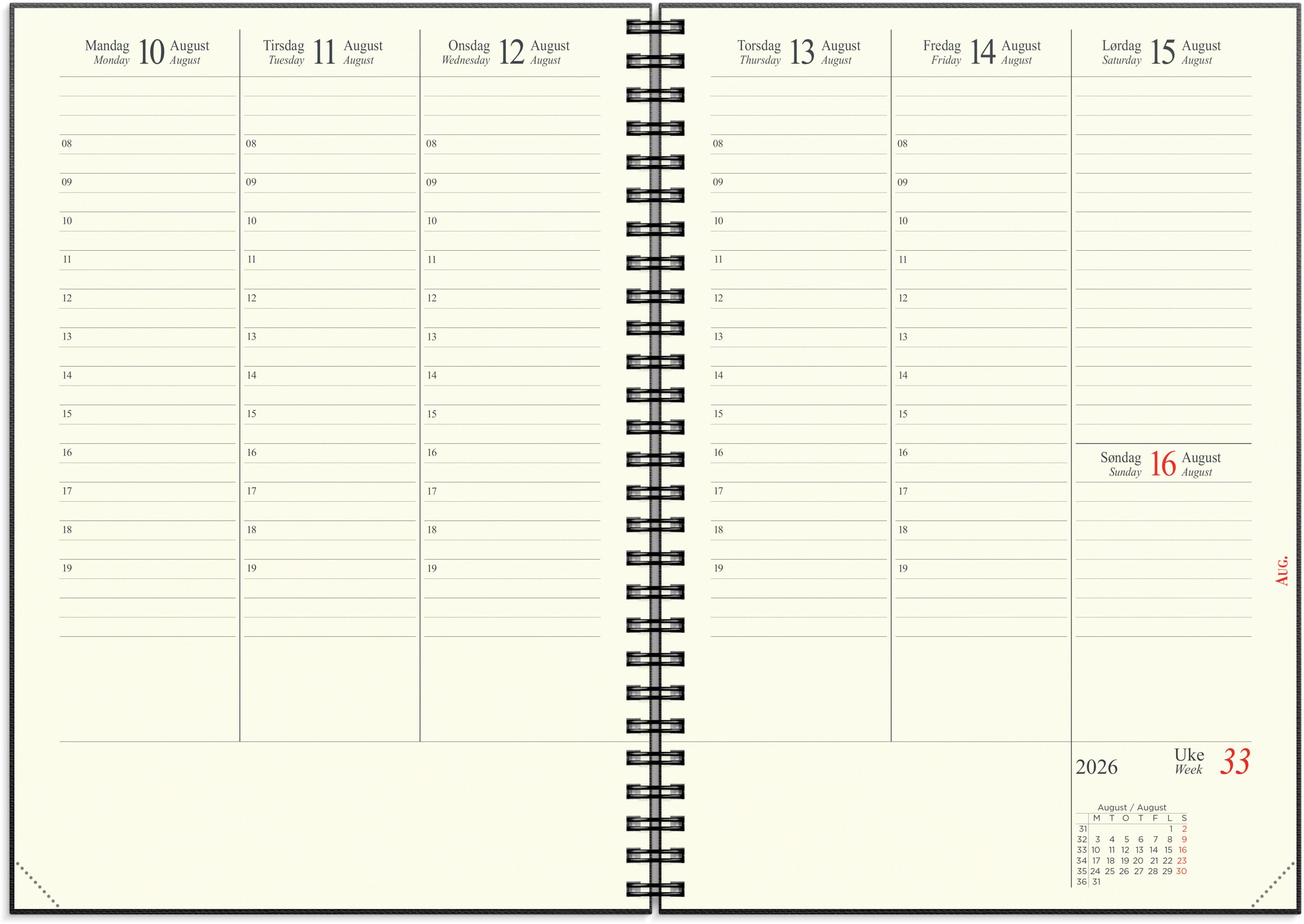 Planlegg med presisjon og eleganse med spiraliserte GRIEG Sjefskalender A5. Kalenderen kombinerer funksjon og finesse med eksklusivt kremfarget papir, utstanset månedsregister og omslag i mykt kartong. Den praktiske A5-størrelsen gir deg oversikt uten å ta for mye plass, perfekt både på kontorpulten og i vesken. Med både norsk og engelsk kalendarium. Inneholder også kalendariske opplysninger, telefonguide, månedsoversikt, årsoversikt, månefaser, helligdager og kongelige fødselsdager. - Funksjonell spiralisert sjefskalender for året 2026 - Følger kalenderåret - Kartongomslag og kremfarget papir - Stående uke/oppslag. Timeinndeling 8-19 mandag til fredag - Månedsplaner og årsoversikt for inneværende og kommende år - Månefaser, helligdager og kongelige fødselsdager - Hjørneperforering - Antall sider: 136 - Papirvekt: 120g - Format: 151x210mm - Farge: Sort