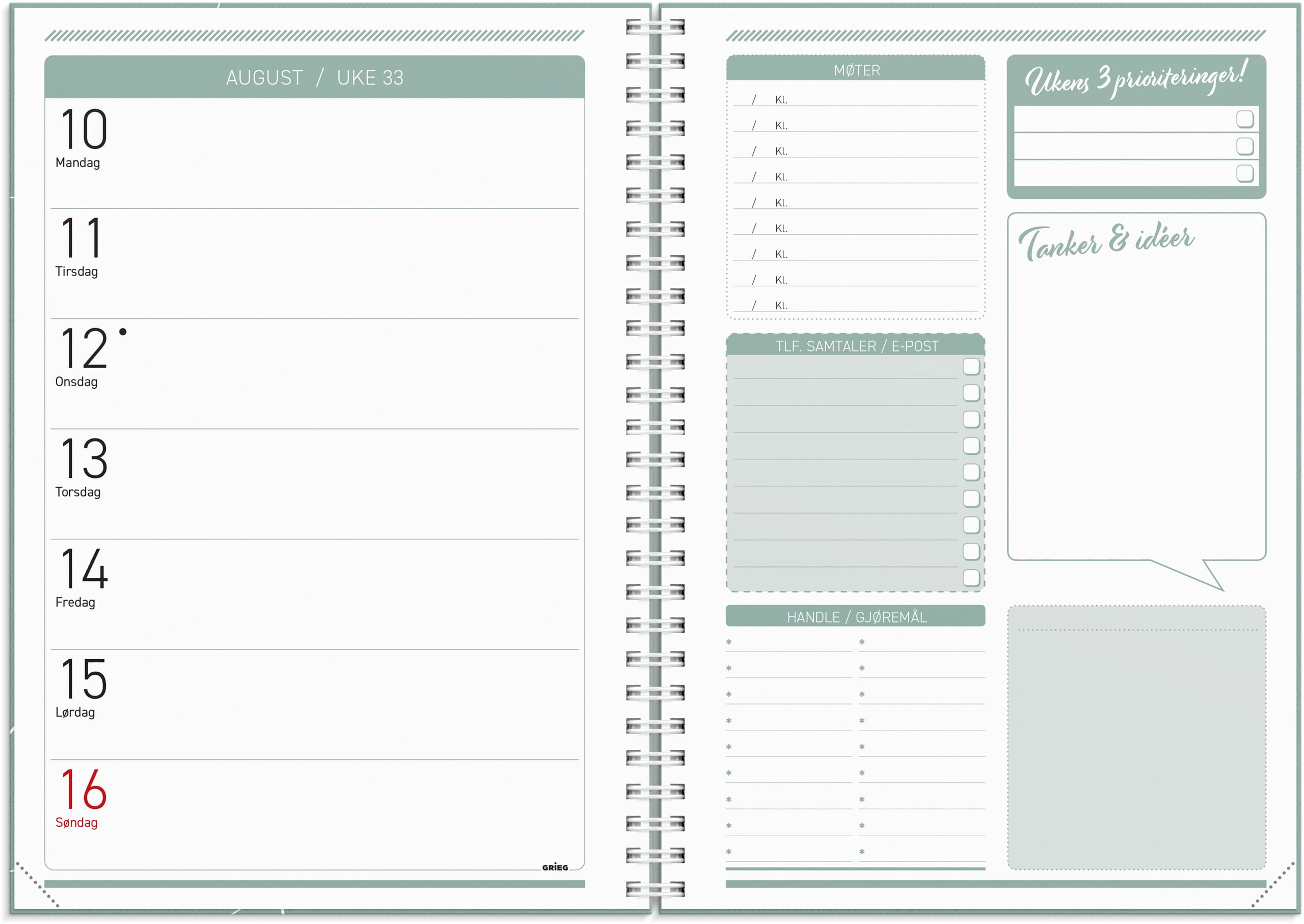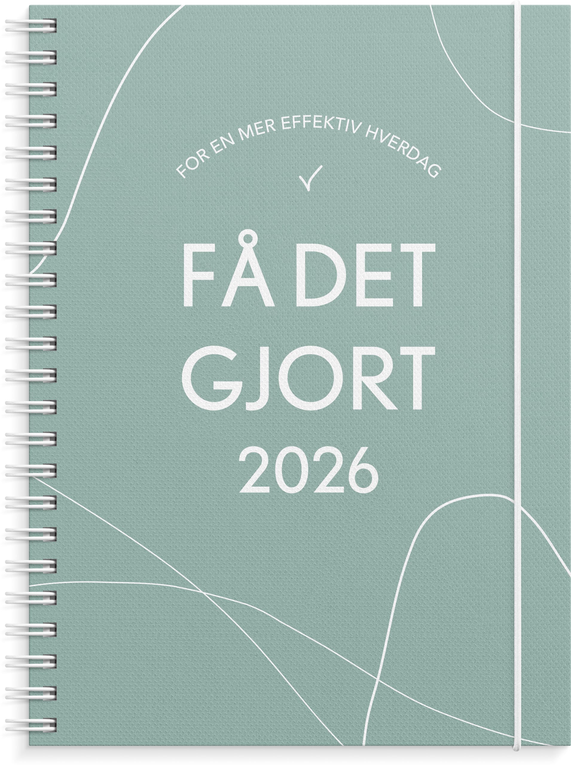 Strukturer dine tanker og gjøremål. Kalenderen Få det gjort hjelper deg med å effektivere og strukturere hverdagen din, så slipper du å ha alt i hodet. Hvert oppslag lar deg planlegge en ny uke, og du finner ulike lister, for eksempel møter, prioriteringer, innkjøp, notater, telefonsamtaler og e-post. Skriv ned dine tanker, ideer og notater på en strukturert og smart måte slik at du kan bruke kapasiteten din på andre ting. Spiralisert ukekalender med trykket kartongomslag og strikk. Dine løse papirer kan du putte i papirlommen bak i kalenderen. Kalenderen er miljømerket FSC®, som betyr at hele produktet er produsert med papir og annet trevirke fra et ansvarlig og bærekraftig skogsbruk. Den inneholder kalendariske opplysninger, helligdager, månedsoversikt og årsoversikt. - Følger kalenderåret - Omslag i kartong - Spiralisert - Strikk - Notatark med linjer - Papirlomme bak - Liggende uke/oppslag - Hjørneperforering - Antall sider: 144 - Papirvekt: 90g - Format: 148x210mm