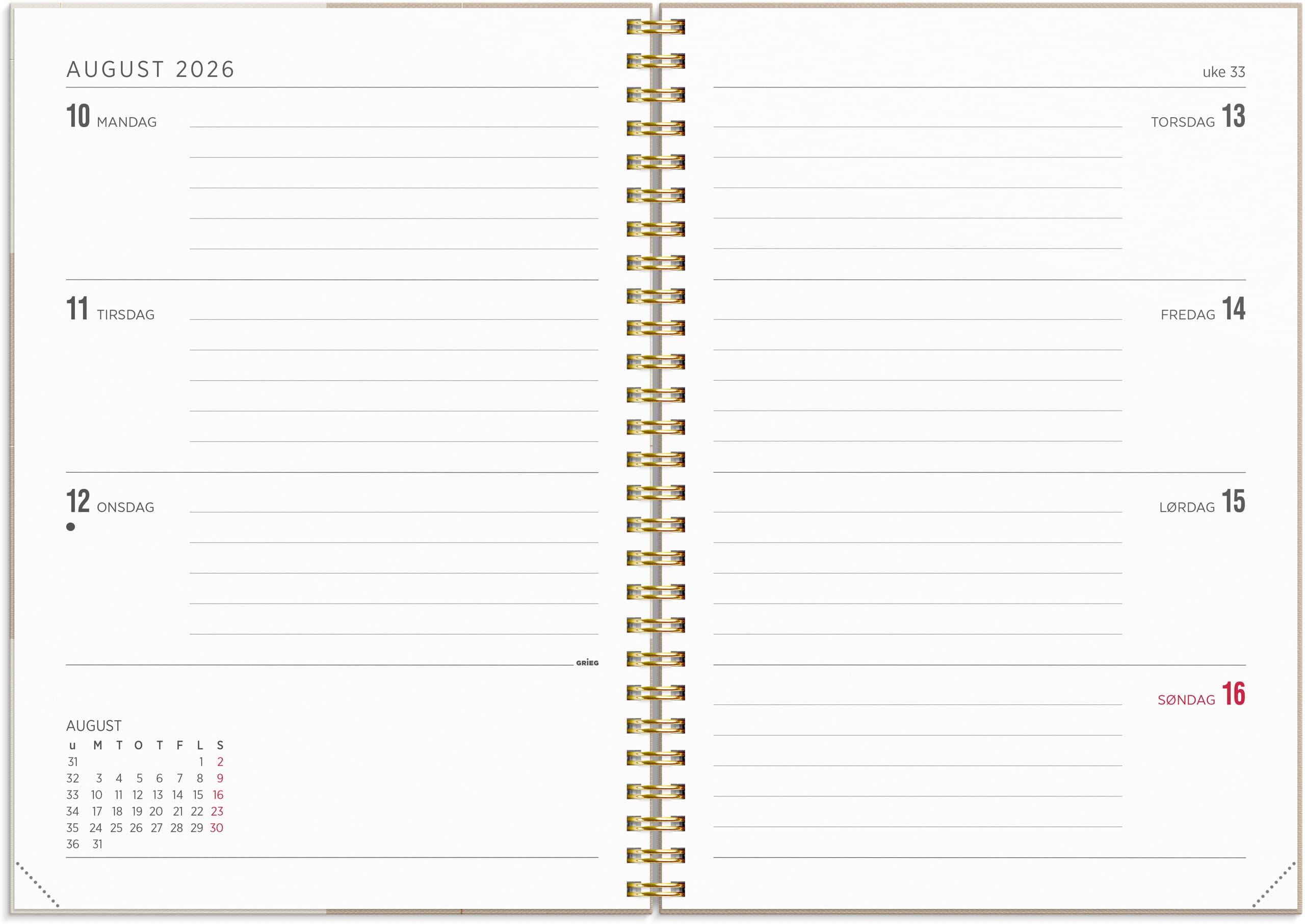 GRIEG Multi A5 2026 gir deg full ukesoversikt i et hendig A6-format, ideell for deg som er mye på farten. Det kompakte designet skjuler en romslig kalender med plass til alt du trenger å notere. Med gullfarget spiral og elegant preget årstall er dette en kalender som kombinerer stil og funksjon. - Spesialisert ukelander for året 2026 - Følger kalenderåret - Kartongomslag med gullpreg - Liggende uke/oppslag - Månedsplaner og årsoversikt for inneværende og kommende år - Månefaser, helligdager og kongelige fødselsdager - Hjørneperforering - Antall sider: 144 - Papirvekt: 90g - Format: 148x210mm - Farge: Beige
