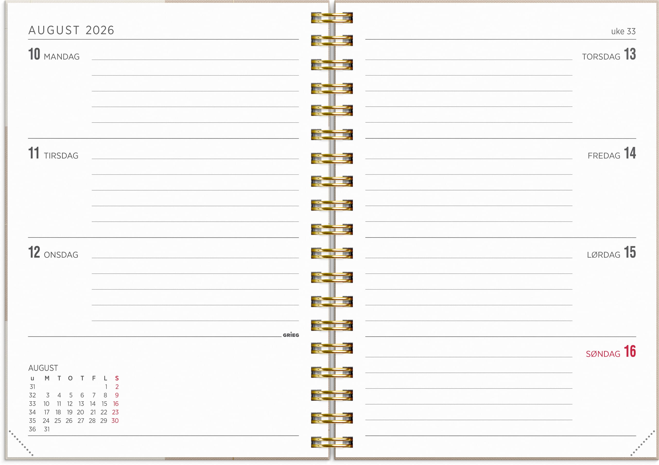 GRIEG Multi A6 2026 gir deg full ukesoversikt i et hendig A6-format, ideell for deg som er mye på farten. Det kompakte designet skjuler en romslig kalender med plass til alt du trenger å notere. Med gullfarget spiral og elegant preget årstall er dette en kalender som kombinerer stil og funksjon. - Spesialisert ukelander for året 2026 - Følger kalenderåret - Kartongomslag med gullpreg - Liggende uke/oppslag - Månedsplaner og årsoversikt for inneværende og kommende år - Månefaser, helligdager og kongelige fødselsdager - Hjørneperforering - Antall sider: 144 - Papirvekt: 90g - Format: 105x148mm - Farge: Beige
