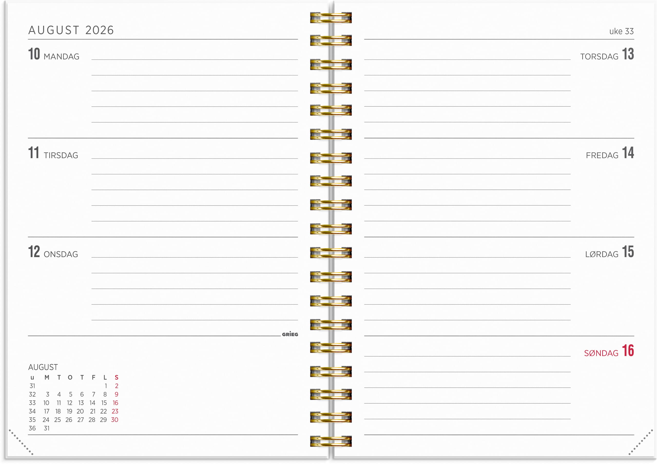 GRIEG Multi A6 2026 gir deg full ukesoversikt i et hendig A6-format, ideell for deg som er mye på farten. Det kompakte designet skjuler en romslig kalender med plass til alt du trenger å notere, og strikken holder alt trygt samlet. Med gullfarget spiral og elegant preget årstall er dette en kalender som kombinerer stil og funksjon. - Spesialisert ukelander for året 2026 - Følger kalenderåret - Kartongomslag med strikk og gullpreg - Liggende uke/oppslag - Månedsplaner og årsoversikt for inneværende og kommende år - Månefaser, helligdager og kongelige fødselsdager - Hjørneperforering - Antall sider: 144 - Papirvekt: 90g - Format: 105x148mm - Farge: Hvit