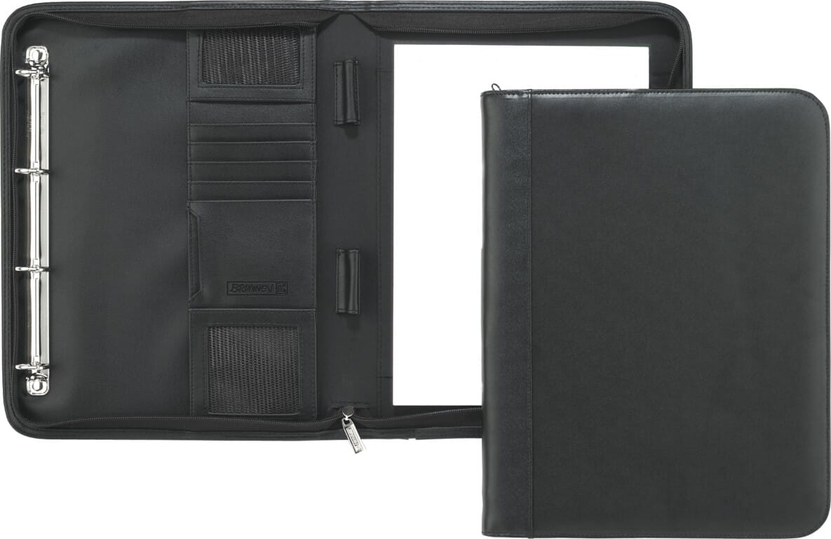 "Konferansemappe Yme er laget i et godt og stilig skinn omslag. Den har god plass for diverse ark, kort ol i tillegg til blokken som medfølger. Den har også ringmekanisme med plass for plastlommer ol.