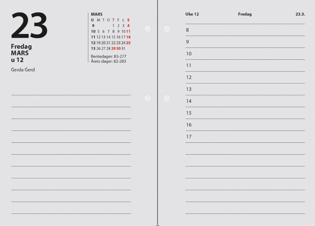 "7.sans Bordkalender er en tradisjonell kalender hvor du har en dag pr oppslag. Blad om for hver dag, og ha styr på dagene som flyr av gårde. God notatplass gir deg en fin oversikt for hver dag. Bordkalender passer til vårt stativ med varenummer 2717794069. Alle 7.sans produkter er miljøsertifisert etter anerkjente internasjonale standarder slik at de minst mulig påvirker vårt felles ytre miljø. Sidestørrelse: 8,3 x 11,9 cm Hullet løsblad 70 gr. En dag pr. oppslag Norsk Klokkeslett fra-til: 08:00-17:00 Årsoversikt inneværende og neste år Gamle merkedager Norske navnedager © Norske helligdager