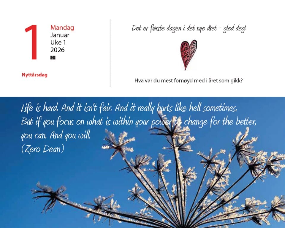 7.Sans Inspirasjonskalender som bordkalender er en inspirasjonskilde for de fleste. Inspirasjon dag for dag, er laget med tanke på å inspirere deg i hverdagen. Alle sitatene og spørsmålene som blir stilt vil kunne bidra til undring, refleksjon og utforsking av muligheter. Kalenderen er en bordkalender med et ark for hver dag, som kan rives av. Perfekt som venninne-, vertinne-,bursdag- og julegave! Alle 7.sans produkter er miljøsertifisert etter anerkjente internasjonale standarder slik at de minst mulig påvirker vårt felles ytre miljø. Sidestørrelse: 17 x 13 cm 60 gr papir En dag pr. side Norsk Topplimt Norske navnedager © Norske helligdager