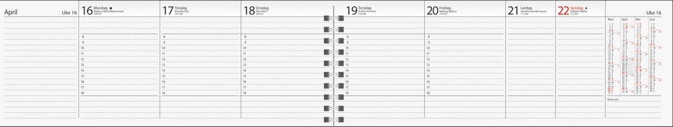 "7.sans Ukeplankalender er for mange uunnværlige på arbeidsplassen eller i hjemmet. Ukeplankalender er en kalender som er utmerket for oversikt på kontorpulten. En uke pr oppslag gir deg raskt oversikt over gjøremål. Passende stativ for pulten er artikkel nr 2717794569. Alle 7.sans produkter er miljøsertifisert etter anerkjente internasjonale standarder slik at de minst mulig påvirker vårt felles ytre miljø. Sidestørrelse: 25,5 x 9,5 cm Kartongomslag Grønn Spiralisert 80 gr papir En uke pr. oppslag Norsk Klokkeslett fra-til: 08:00-18:00 2 farger sort og rød i kalender Årsoversikt inneværende og neste år Månedosversikt inneværende og neste år Norske navnedager © Norske helligdager