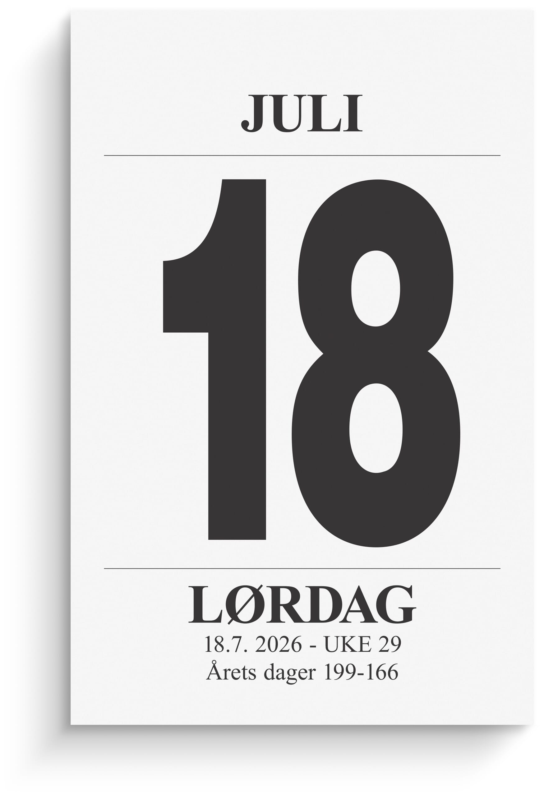Med Avrivningskalender Medium får du en god oversikt over dagen i dag. Dag pr. side, med daglig praktisk info. Årets dager, helligdager og kongelige fødselsdager. Store tall gjør det lett å se datoen på avstand. Riv av for neste dag. Kalenderen er miljømerket FSC®, som betyr at hele produktet er produsert med papir og annet trevirke fra et ansvarlig og bærekraftig skogsbruk. - Følger kalenderåret - For avrivning pr. dag - Angivelse av årets dager - Helligdager - Kongelige fødselsdager - Stående dag/side - 736 sider - 60g papir - Format: 83x128mm