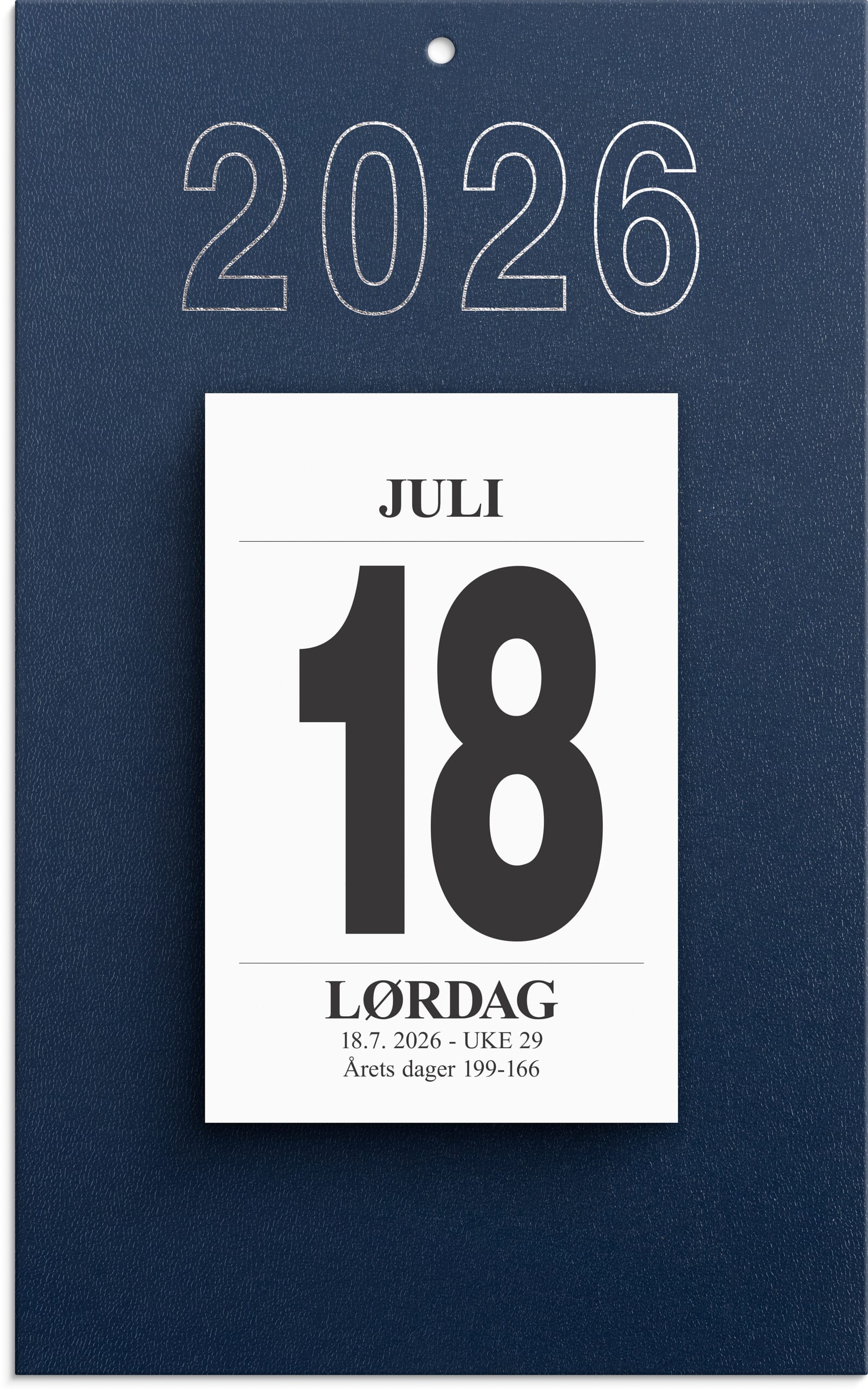Med Avrivningskalender Medium får du en god oversikt over dagen i dag. Kalenderen kommer med bakplate med hull for oppheng. Dag pr. side, med daglig praktisk info. Årets dager, helligdager og kongelige fødselsdager. Store tall gjør det lett å se datoen på avstand. Riv av for neste dag. Kalenderen er miljømerket FSC®, som betyr at hele produktet er produsert med papir og annet trevirke fra et ansvarlig og bærekraftig skogsbruk. - Følger kalenderåret - For avrivning pr. dag - Med bakplate - Angivelse av årets dager - Helligdager - Kongelige fødselsdager - Stående dag/side - 736 sider - 60g papir - Format: 83x128mm, Bakplate: 160x260mm