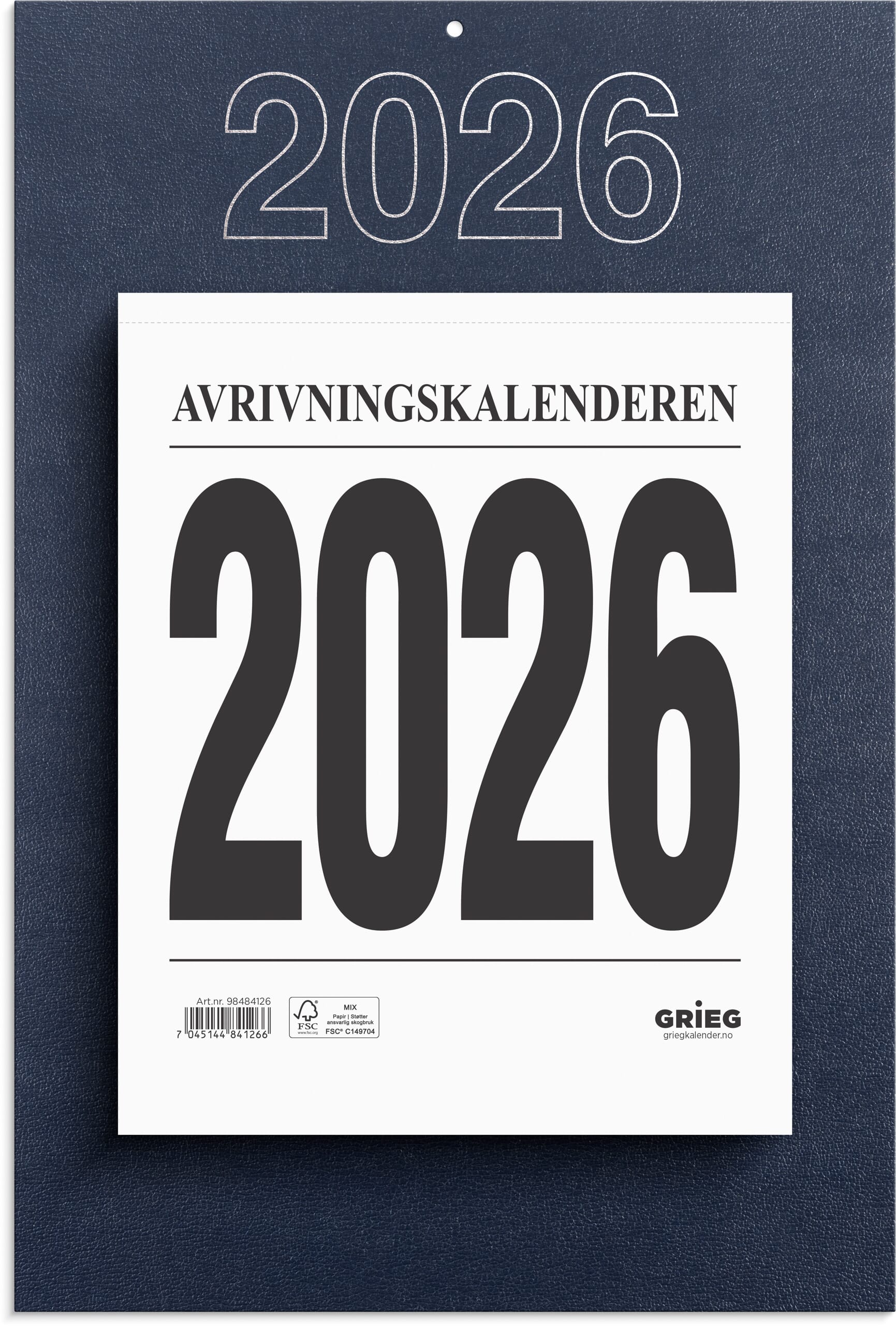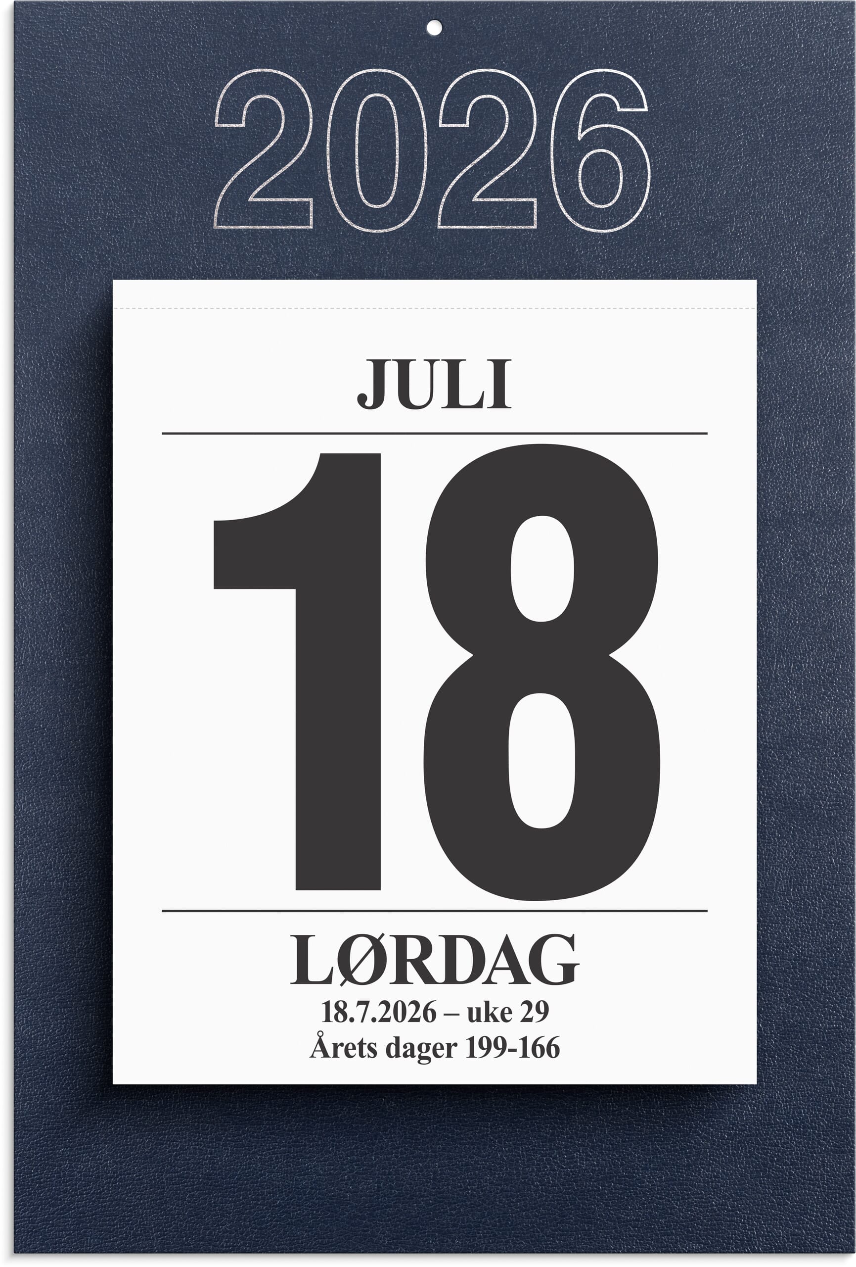 Med Avrivningskalender Stor får du en god oversikt over dagen i dag. Kalenderen kommer med bakplate med hull for oppheng. Dag pr. side, med daglig praktisk info. Årets dager, helligdager og kongelige fødselsdager. Store tall gjør det lett å se datoen på avstand. Riv av for neste dag. Kalenderen er miljømerket FSC®, som betyr at hele produktet er produsert med papir og annet trevirke fra et ansvarlig og bærekraftig skogsbruk. - Følger kalenderåret - For avrivning pr. dag - Med bakplate - Angivelse av årets dager - Helligdager - Kongelige fødselsdager - Stående dag/side - 736 sider - 60g papir - Format: 197x246mm, Bakplate: 240x420mm