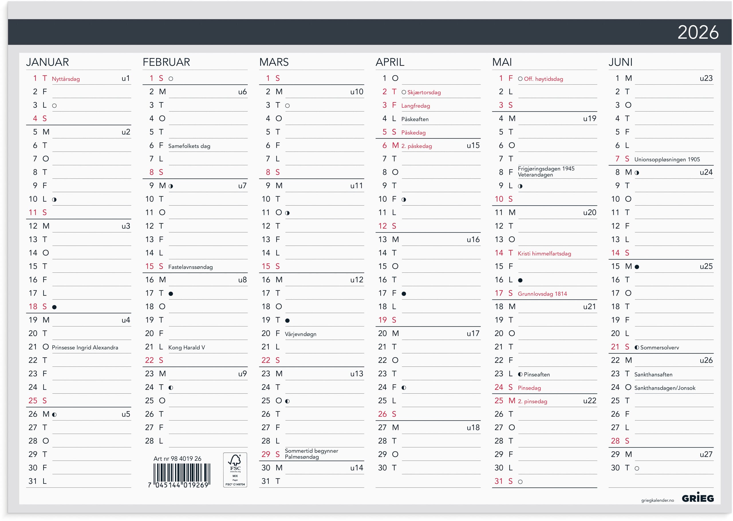 Platekalender i kartong med 6 mnd. på hver side, som gir deg rask og god oversikt over hele året. Med plass for notater, oversikt over månefaser, helligdager og kongelige fødselsdager. Opphengshull gjør det enkelt å henge den på veggen. Kalenderen er miljømerket FSC®, som betyr at hele produktet er produsert med papir og annet trevirke fra et ansvarlig og bærekraftig skogsbruk. - Følger kalenderåret - Trykket på kartong - Notatplass hver dag - Helligdager - Månefaser - Kongelige fødselsdager - Stående halvår/side - 2 sider - 350g kartong - Format: 297x210mm