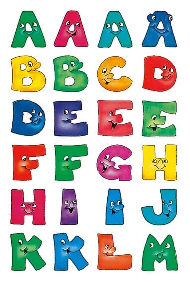 Selvklebende bokstaver med artige ansikter,for identifisering og merking.2 ark.