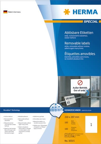 Stabilt festet med Movables®-teknologi, fester på alle slette, tørre og rene overflater. Helt avtakbare uten å etterlate seg rester. Perfekt for midlertidige merkinger eller for ømfintlige overflater. Til laser-, inkjet- og matriseskrivere, kopimaskiner, samt fargelaserskrivere.