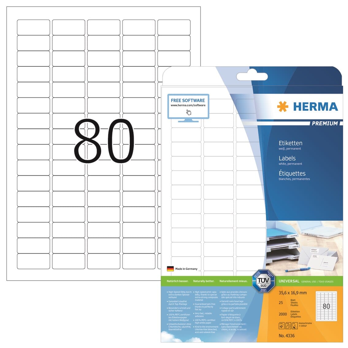 Hvite, permanente heftende etiketter som med ny teknologi også fungerer i skrivere og kopimaskiner med høyastighet utskrift. Like bra i sort/hvitt som i farger. PEFC-sertifisert. Etikettene er helt hvite og gir meget skarpe utskrifter. Gratis software solutions: www.Herma.com/software.