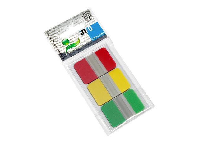 Index med praktisk plastklips på baksiden med eurohullLaget med miljøvennlig, vannbasert limStørrelse: 25 x 38mm3 farger, 25 ark per farge