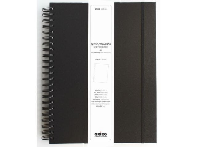 Spiralisert rygg, strikk for lukking og perforert rivekant på arkene Kunstskinn hardcover - Skisse -og tegnebok i 150g kvalitet - Kremfarget syrefritt papir - Størrelse: 210 x 297 mm, 50 ark.
