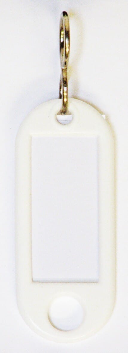 Nøkkelbrikke i plast med etikettholder, utstyrt med vindu og etikett. Brikke: 54 x 21mm, etikett: 32 x 14mm. 100st/fp.