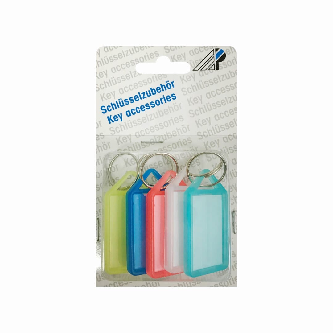 Transparent farget PP-plast, etikettholder med vindu og etikett. Brikke 55 x 30mm, etikett 38 x 21mm. Enkel ring.