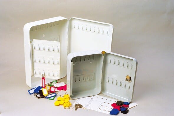 Nøkkelskap laget av stål med sylinderlås, leveres med 2 nøkler og 105 nøkkelbrikker. 360 x 250 x 110 mm.