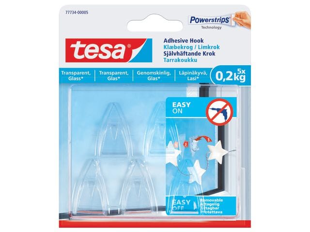 tesa® limkroker for gjennomsiktige flater og glass 0,2 kg er gjennomsiktige kroker som i kombinasjon med tesa® selvklebende strimler for gjennomsiktige flater og glass 0,2 kg, som følger med, kan inneholde opptil 0,2 kg per krok.