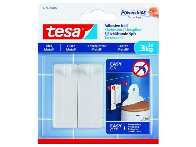 tesa® limspiker for fliser og metall og tilsvarende selvklebende strimler som følger med kan holde opptil 3 kg per spiker. De er spesialdesignet for å pålitelig holde pyntegjenstander og kjøkkenutstyr på glatte og faste innendørs overflater som fliser, de fleste metaller og plast. Enkelt og praktisk montering uten å skade overflaten og stresset forbundet med en hammer eller boremaskin. Powerstrips-teknologien gjør det mulig å fjerne limspikeren i løpet av sekunder, og etterlater ingen spor på overflaten, og er gjenbrukbar med et nytt tesa® selvklebende strimmel.