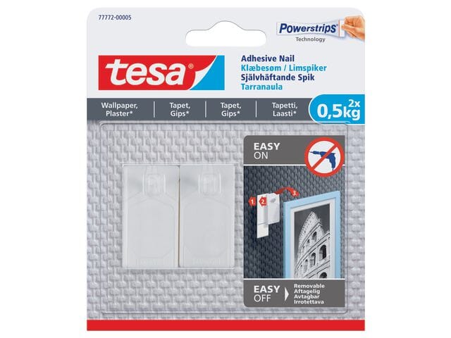 tesa® limspiker for tapet og gips og tilsvarende selvklebende strimler som følger med er spesielt designet for enkel montering og et sikkert grep på strukturerte og sensitive overflater som tapet eller gips og holder opptil 0,5 kg per spiker.