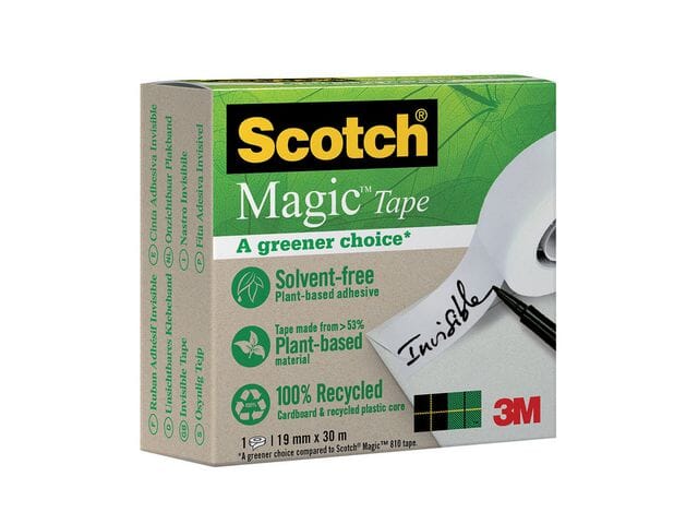 Laget av mer enn 53 % plantebaserte materialerKjernen og emballasjen er laget av 100 % resirkulert kartong og plastPlantebasert lim som ikke inneholder løsemidlerUsynlig teip som ikke vises på fotokopierKan skrives på med penn, blyant eller merkepenn for merkingGulner ikke og tørker ikke utTeipstørrelse: 19 mm x 30 mTeipfarge: Gjennomsiktig
