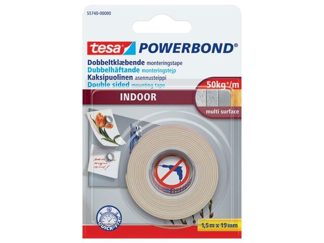 tesa® Powerbond® INDOOR er veldig enkel å bruke hvis du skal feste en liten, flat gjenstand, opptil 10 mm tykt, på et jevnt underlag, for eksempel på fliser, gipsplater, trepaneler og plast. Du slipper også å bore hull i veggen og oppnår et profesjonelt utseende uten bruk av stygge skruer og spiker. Ideell for bruk innendørs – du kan kutte den størrelsen du ønsker og feste på baksiden av en gjenstand. Dra av baksiden for å sette på den dobbeltsidige teipen, med ekstra kraftig lim for permanent festing. Hver teiprull måler 19 mm x 1,5 m og leveres i en enkelt pakke.