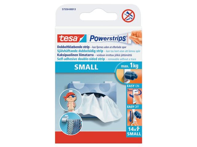 tesa® Powerstrips Small er designet til rask og sikker montering av små og flate gjenstander med en vekt på opptil 1 kg.