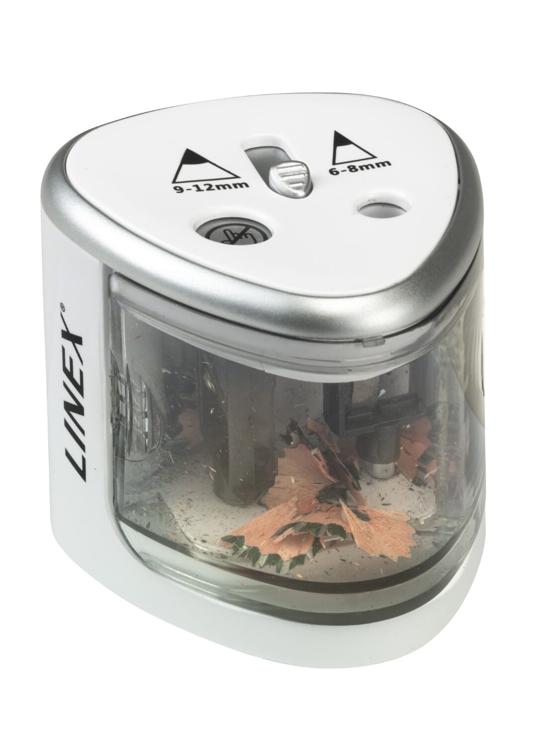 Batteridrevet blyantspisser til standardblyanter (diameter 6–8 mm) og jumboblyanter (diameter 9–12 mm). Gjennomsiktig beholder som gjør det enkelt å se når den må tømmes. Bruker fire 1,5 V AA-batterier, medfølger ikke.