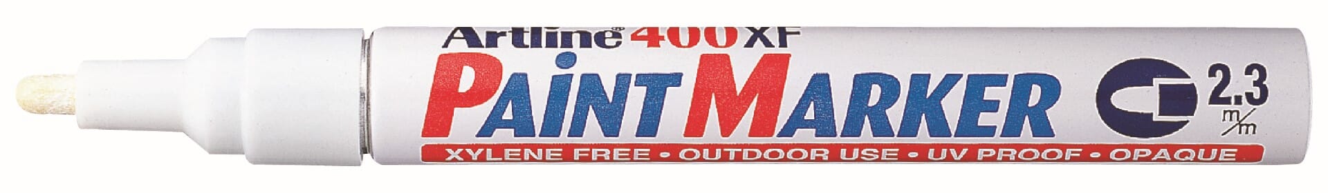 Merkepenn med 2.3 mm rund spiss. For permanent merking innen- og utendørs, meget vannfast og fargen blekes ikke, aluminiumhylse, pigmentfarge uten Xylen. Farge: Hvit.