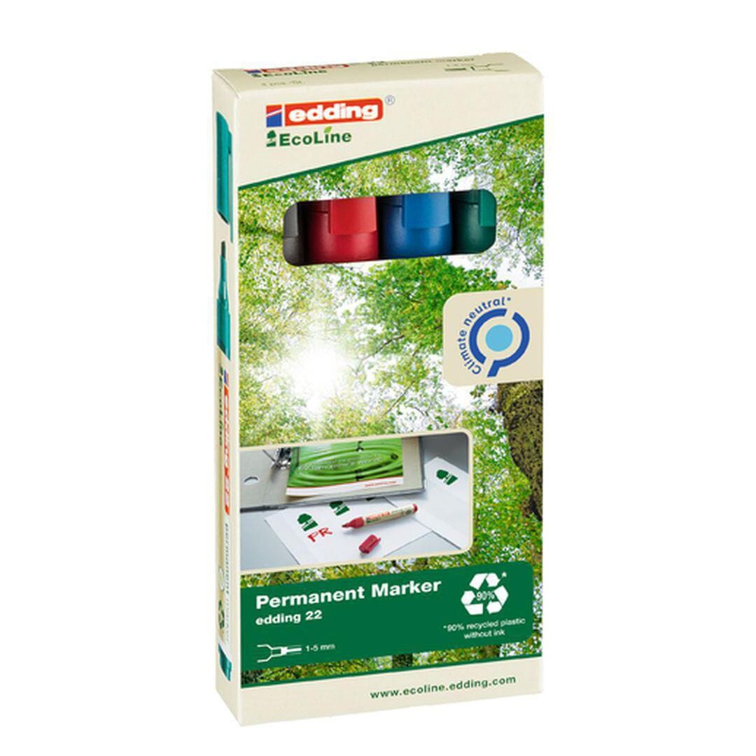 Edding 22 EcoLine permanent merkepenn skriver i permanent blekk på nesten alle materialer, og bruker plast laget av 90 % resirkulerte materialer. Denne permanente merkepennen Edding 22 for finskriving utmerker seg med miljøvennlige materialer. Denne merkepennen har en skråskåret spiss med lengde på omtrent 15 mm, og lysbestandig og slitasjebestandig blekk gjør den ideell for nesten alle overflater, som plast, metall, glass osv. Dette alkoholbaserte blekket med lite lukt er xylen- og toulenfritt, og som med alle permanente merkepenner i EcoLine-serien er edding 22 laget av 90 % resirkulert materiale. - Minst 90 % av plasten kommer fra gjenvunnet materiale - Blekket er permanent, hurtigtørkende, vann- og flekkbestandig - Utformet for bruk til en rekke forskjellige oppgaver - Skriver på nesten alle overflater, som plast, metall, glass og treverk - Skråskåret spiss til fet skrift - Strekbredde: 15 mm - Luktløst blekk - Lett utførelse for komfortabel skriving - Lommeklips og hette som gjør den mer bærbar - Kan etterfylles - Assorterte farger: sort, blå, rød og grønn - Pakke med 4