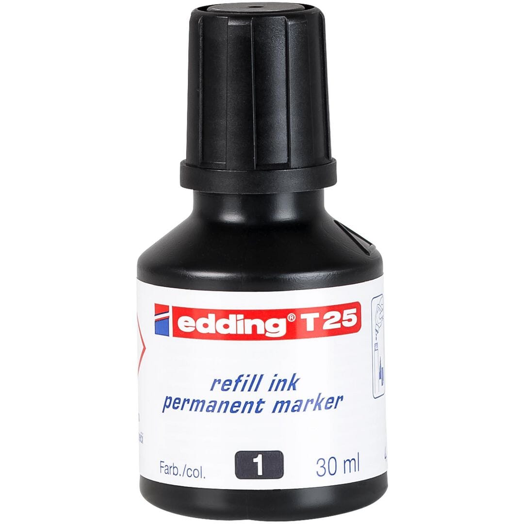 Få permanentmarkerne dine til å leve lengre med edding T25 refill-blekk en smart, rask og økonomisk løsning for alle standard edding permanent markers. Den praktiske drop-dispenseren gir presise påføringer og fyller blekket på tett og effektivt, uten søl. Velg blant ti livlige farger slik at favorittmarkøren alltid er klar til bruk. Den hurtigtørkende, luktarme og vann- og lysekte formelen sikrer skarpe, smussbestandige merker som varer. - Refill blekk til merkepenn - Drop-dispenser for presis påfylling - Permanent, luktarm, vannfast, smussbestandig, lysbestandig - Volum: 30ml - Farge: Sort - For bruk med edding 1, 370, 390, 400, 500, 550, 800, 850, 2000C, 2200C, 3000, 3300 + EcoLine 21/22/25