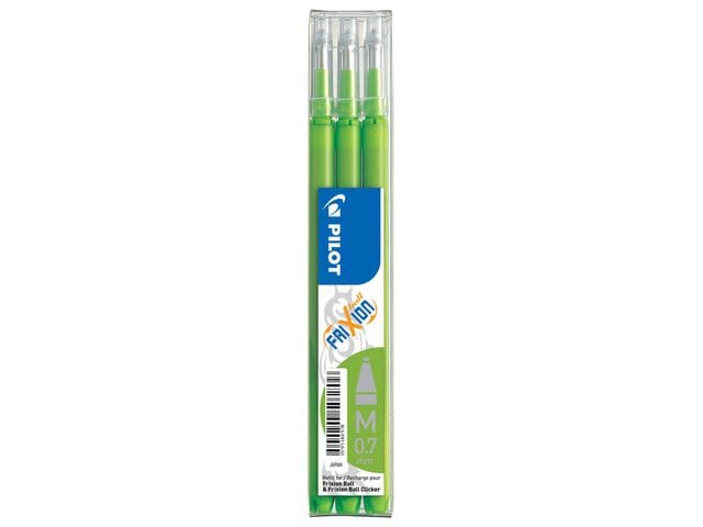 BLS-FR7 refillFin spiss: 0,7 mmPresisjon og nøyaktighetVarmesensitivt blekk Kraftig spiss av wolframkarbid Visker ut med friksjon og skriver over umiddelbart Refill for tids- og kostnadsbesparelserKan brukes med følgende Pilot-penner med 0,7 mm spiss: FriXion Ball og FriXion Clicker Farge: LysegrønnPakke med 3