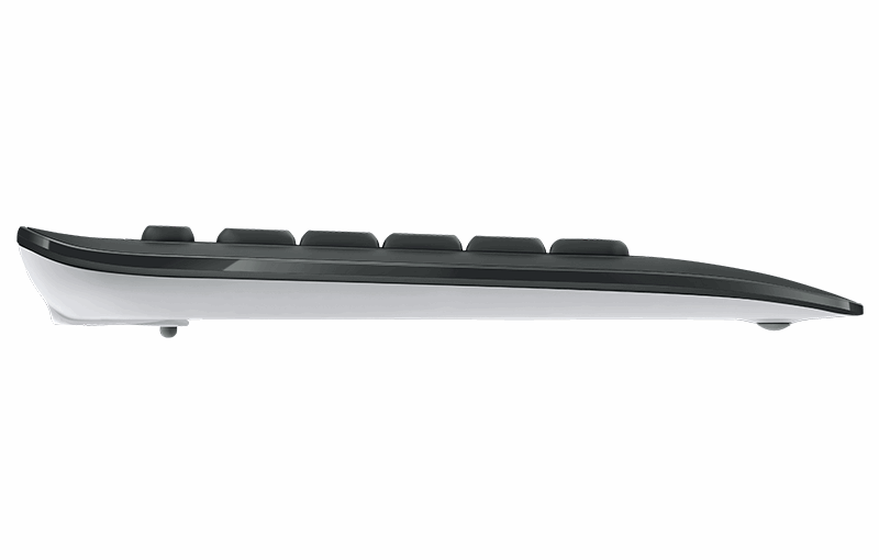 Tastaturet i full størrelse har taster med kjent utforming, størrelse og virkemåte – optimalisert for presisjon og støyreduksjon. Den avrundede musen for høyre- og venstrehendte er utformet slik at den ligger behagelig i begge hender.