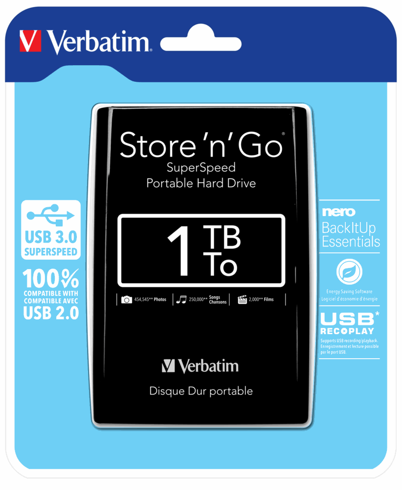 "Verbatim Store n Go bærbar harddisk gir høy ytelse lagring ved hjelp av et USB 3.0 ""Super Speed"" grensesnitt. USB 3.0 gir opptil 10 ganger raskere dataoverføring enn USB 2.0 (basert på USB-busshastighet), og gir rask overføring av data direkte på nettstedet. Ta med deg digitale og daglige arbeidsfiler til denne ekte mobilstasjonen. Den slanke og smarte designen ser bra ut på det moderne skrivebordet som det perfekte tilbehøret til den bærbare datamaskinen. Store n Go-bærbar harddisk drives via USB 3.0 (1 x USB 3.0-grensesnitt) og likevel bakoverkompatibel med en hvilken som helst USB 2.0-port på PCen eller notisboken. Drevet krever ingen ekstern strøm til å kjøre - det er bare plug n play. Large 'n' Go-bærbare harddisker er formatert med FAT32, som tillater bruk på Windows OS og Mac OS-systemer. Som ekstra sikkerhet hjelper Nero BackItUp og Burn Essentials-programvare til å sikkerhetskopiere bærbar PC eller PC-harddisk. BackItUp og Burn Essentials leverer 3 programmer i 1. Sikkerhetsko"