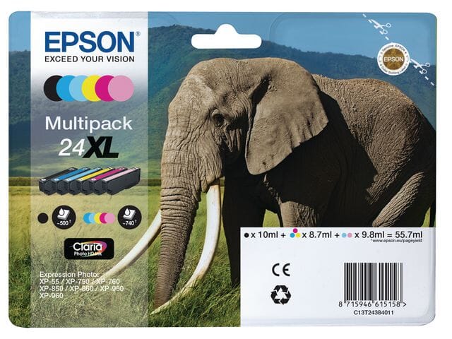 Farge: Svart, cyan, magenta, gul, lys cyan, lys magentaUtskriftskapasitet: Opptil 740 A4-siderVolum: 55,7 mlEpson Claria Photo HD Ink-serienFlotte og profesjonelle fotografiske utskrifterEpson-serie: ElephantKompatibel med: XP-55 / XP-750 / XP-760 /XP-850 / XP-860 / XP-950 / XP-960