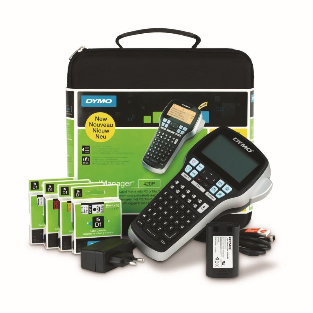 Dymo® Label programvaren gir deg mulighet til å klippe ut og sette inn tekst, strekkoder, grafikk og logoer. Kombipakke med merkemaskin, Dymo® LabelManager 420P KitCase. Denne kombipakken er den perfekte startpakken når du trenger en ny merkemaskin. Den inneholder en LabelManager 420P, fire D1-teksttape og en praktisk veske som du kan oppbevare etikettskriveren i når du ikke bruker den eller skal transportere den.