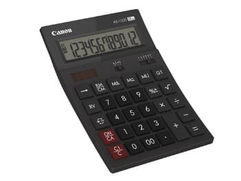 Bordkalkulator Canon® AS-1200 med de grunnleggende funksjonene. Øvre og nedre deksel er laget av gjenbruksmaterialer.