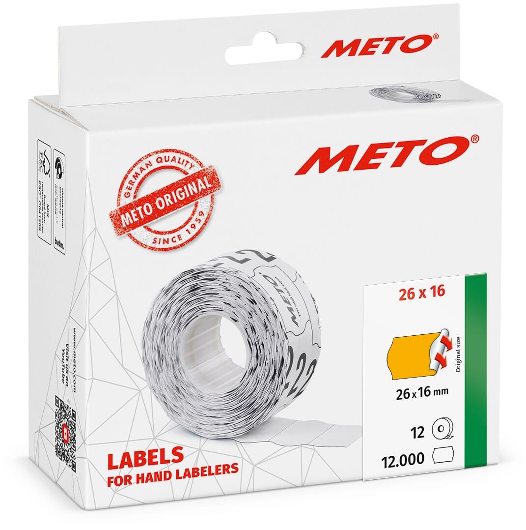 Pris- og datomerkeetiketter fra METO er den ideelle løsningen for profesjonell og presis merking av for eksempel produkter, varer og emballasje hvor nøyaktig informasjon må angis. Etikettene har størrelse 26 x 16 mm og er permanent heftende. De er neon-oransje og spesielt velegnet til kampanjer, tilbuds- og rabattmerking, samt annen informasjon som skal tiltrekke oppmerksomhet. METOs etiketter med varenummer 30007352 passer til alle vanlige 2-linjers håndholdte prispistoler med etikettdimensjonen 26 x 16 mm. De har universalmål og UTC (universal transport cut), som sikrer stabil mating og høy ytelse. Etikettene er kompatible med METO Arrow, Eagle, Flash og ProLine, samt prispistoler fra Avery, Contact, Blitz, Tovel, Open, Sato, Etimark, Samark, Jolly, Herlitz, Prix m.fl. Limtypen har høy klebeevne på de fleste overflater og er ISEGA-godkjent for direkte kontakt med tørre eller fuktige, ikke-fettede næringsmidler. Limet gjør det vanskelig å fjerne etiketten uten å ødelegge d