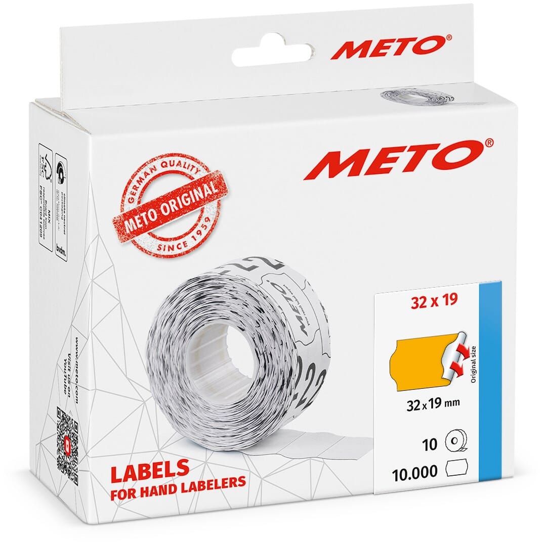 Pris- og datomerkeetiketter fra METO er utviklet for profesjonell, pålitelig og presis merking av produkter og emballasje. METOs etiketter med varenummer 30007363 passer til alle vanlige 2-linjers håndholdte prispistoler med etikettdimensjon 32 x 19 mm. De har universalmål og UTC (universal transport cut), som gir god mating. De er neonoransje og egner seg godt til bruk i kampanjer og annen visuell prising. Klebemiddelet er sterkt og vanskelig å fjerne, og etikettene ødelegges vanligvis ved forsøk på å ta dem av, noe som beskytter mot misbruk og etikettbytte.