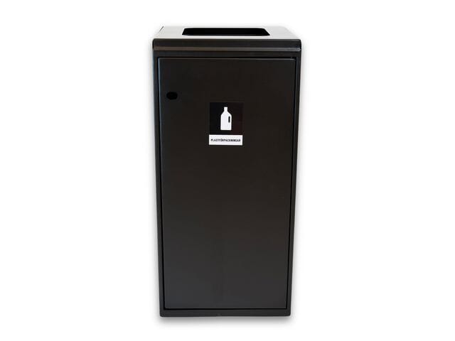 Stilren og robust avfallsbeholder med lokk og kvadratisk åpning. Utstyrt med døråpning for ergonomisk uttak av avfallssekk, samt justerbare føtter.