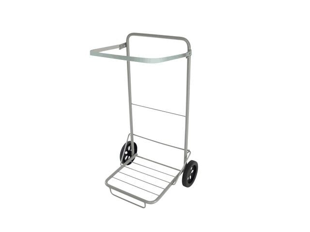 Sammenleggbart avfallsstativ med store lettrullende hjul i lakkert stål.