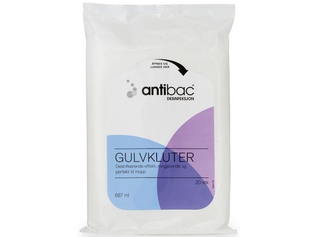 Antibac® Gulvkluter er store engangskluter av 100% biologisk nedbrytbart materiale, egnet til rengjøring av gulv eller andre store overflater.